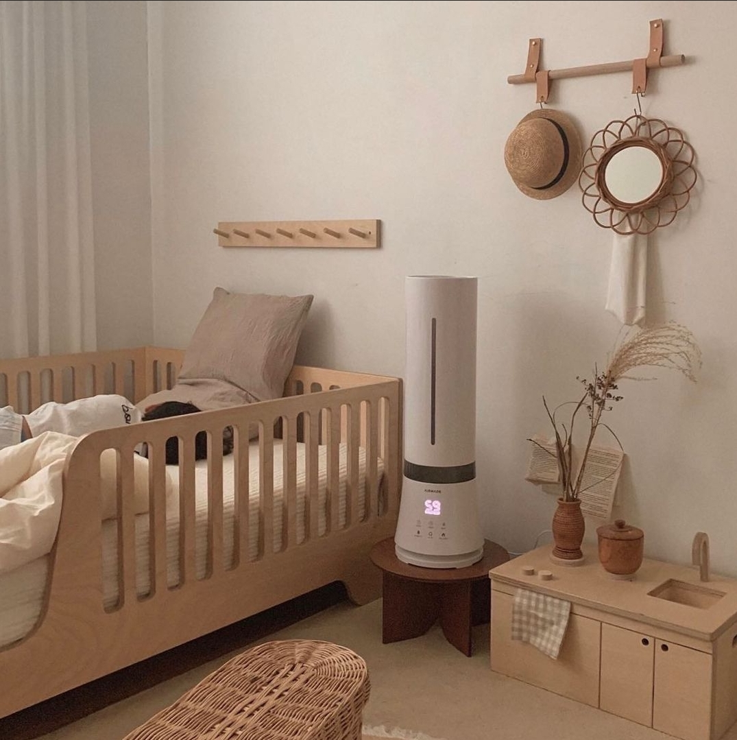 에어메이드 가습기는 전반적으로 화이트톤을 보여 깔끔하면서도 세련된 이미지를 주면서, 가습기의 중하 단부분에 포인트로 로즈골드 색상의 원형 띠를 넣어 우아하면서도 감각적인 느낌을 줍니다. 또한, 타워형으로 길게 위로 뻗어있는 모양은 안정적이고 감각적이면서도 시원시원한 느낌을 주는 미적인 역할과 동시에 높은 타점에서 분무가 가능하게끔 해 광범위하게 가습을 해줄 수 있게 기능적인 측면도 고려했습니다. 그리고 야간에는 LED램프에 불빛이 들어와 저녁에 무드등의 역할도 해내고 있어 인테리어 소품으로써의 역할도 훌륭하게 소화하고 있습니다.(취침 시에는 LED램프를 소등할 수 있어 수면 방해가 되지 않습니다.)