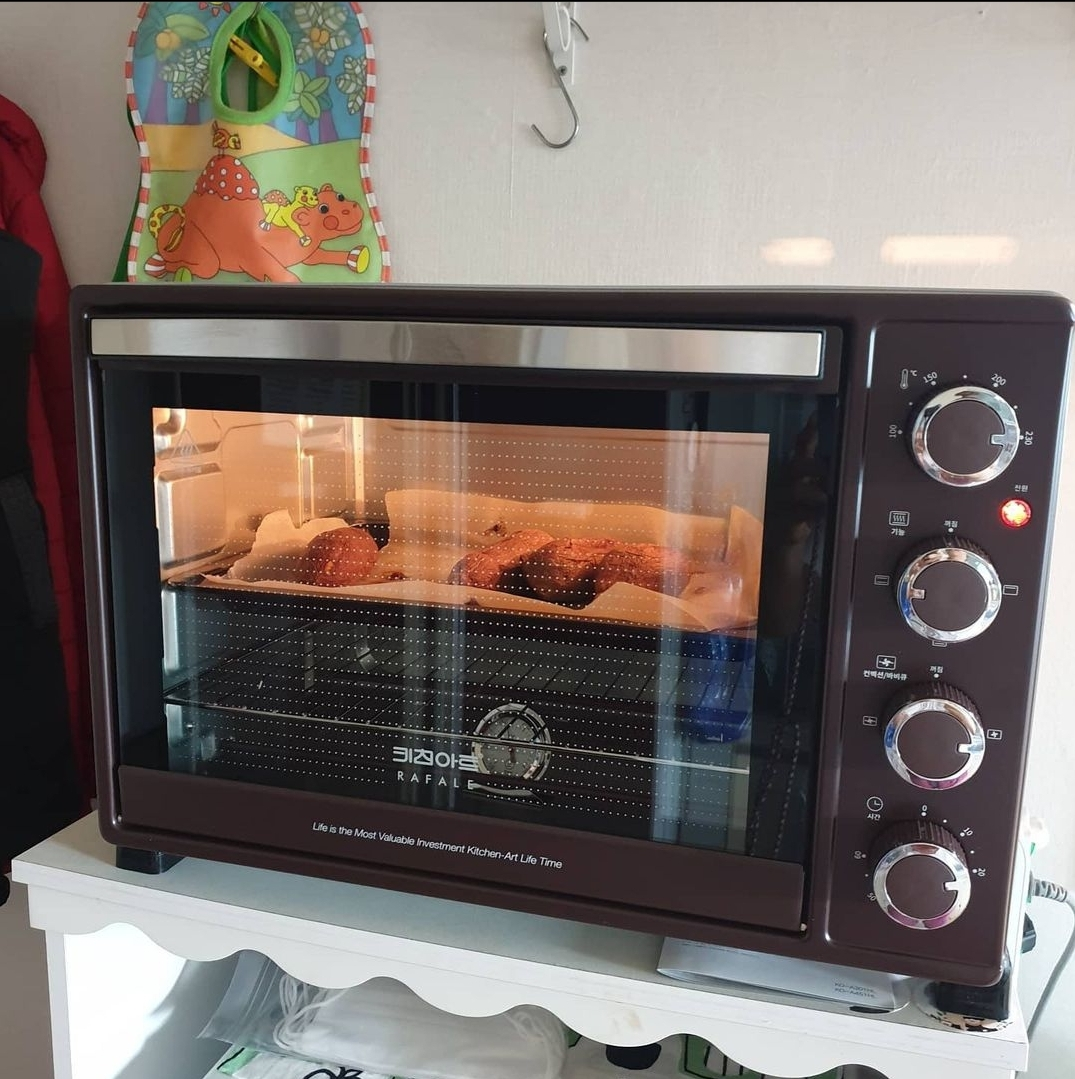 이 오븐은 내부의 팬이 회전하는 컨벡션 기능과 바베큐 봉이 회전하는 바베큐 기능을 제공합니다. 컨벡션 기능은 여러 음식이 골고루 익을 수 있도록 내부의 공기를 순환시켜 주기 때문에 빵이나 쿠키종류를 베이킹 할 때도 유용하고, 고구마나 감자, 생선, 고기 등을 구울 때에도 빠짐없이 골고루 익혀줍니다. 또한, 내부에 회전하는 바베큐 봉이 있는데, 그 곳에 돼지고기나 통닭을 꽂아넣고 구우면 기름기가 싹 빠진 바삭바삭하고 담백한 바베큐 요리를 먹을 수 있습니다. 저는 처음 오븐을 살 때에는 베이킹을 하기 위해 구매를 했었는데, 최근 코로나로 인해 밖에서 음식을 사먹는게 제한이 되다보니 이 기능을 많이 이용하고 있습니다. 퇴근해서 집에 오는 길에 마트에서 닭을 한 마리 산 다음, 씻는동안 오븐에 넣고 바베큐를 만들며, 씻고 난 다음에 나와서 맥주와 함께 오븐에 잘 구어진 바베큐를 먹는데 정말 맛있습니다. 뿐만 아니라 요즘처럼 추운 겨울철에는 고구마나 감자 등을 잘 씻어 통으로 넣고 군고구마나 구운감자를 만들거나 반을 자른 뒤 위에 버터를 살짝 얹어 고소하게 구워낸다음 간식으로 먹기도 하고, 몇몇 지인을 초대해 전복버터구이나 랍스터버터구이 등 해산물 요리도 직접 만들어 대접하고 있습니다. 이처럼 키친아트 라팔 멀티 바비큐 오븐만 있으면 손쉬운 음식부터 고급진 양식까지 다양한 음식을 손쉽게 만들 수 있습니다.